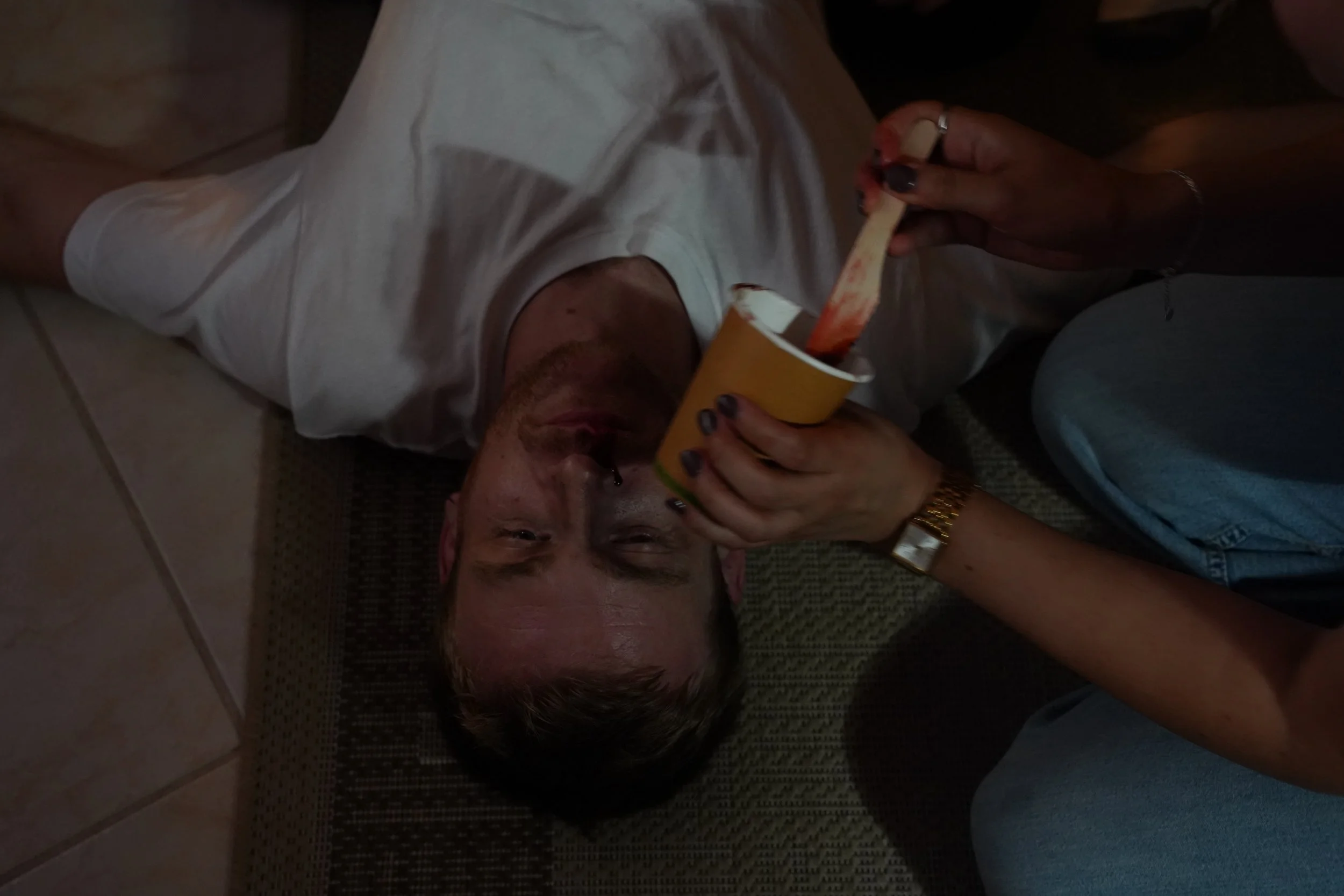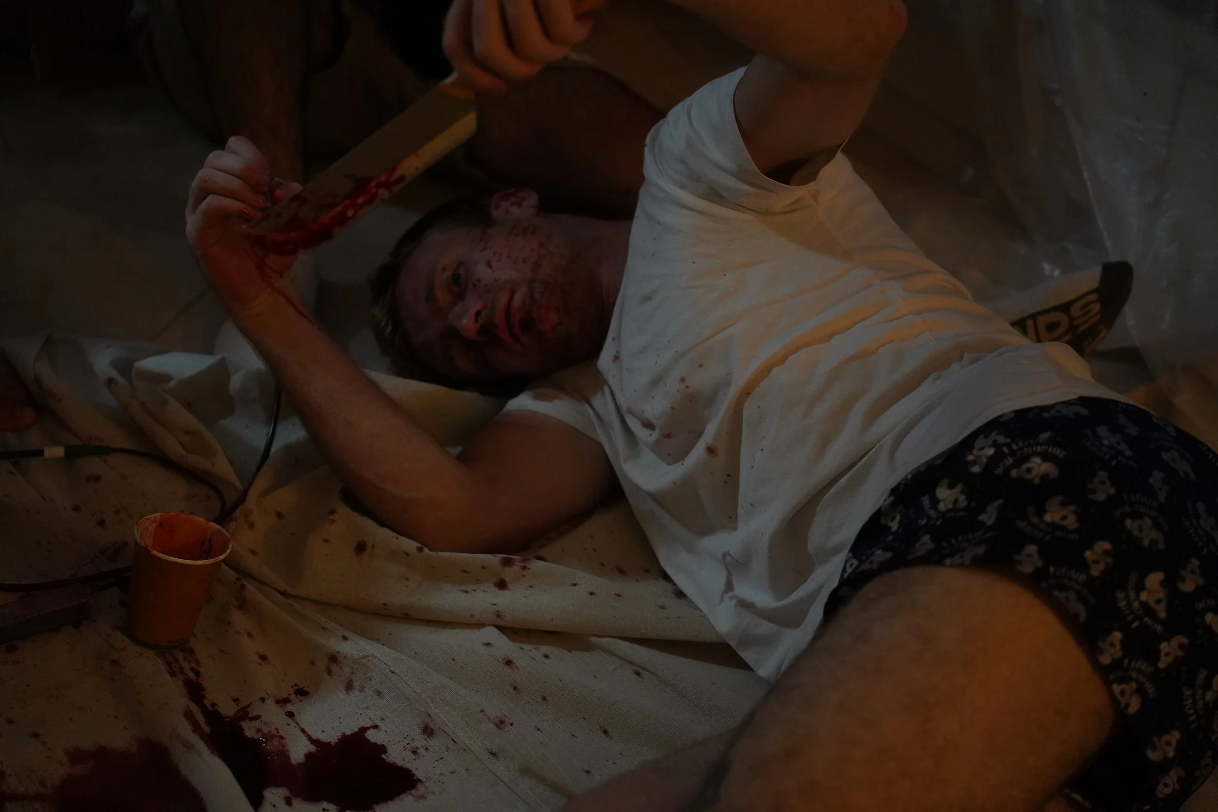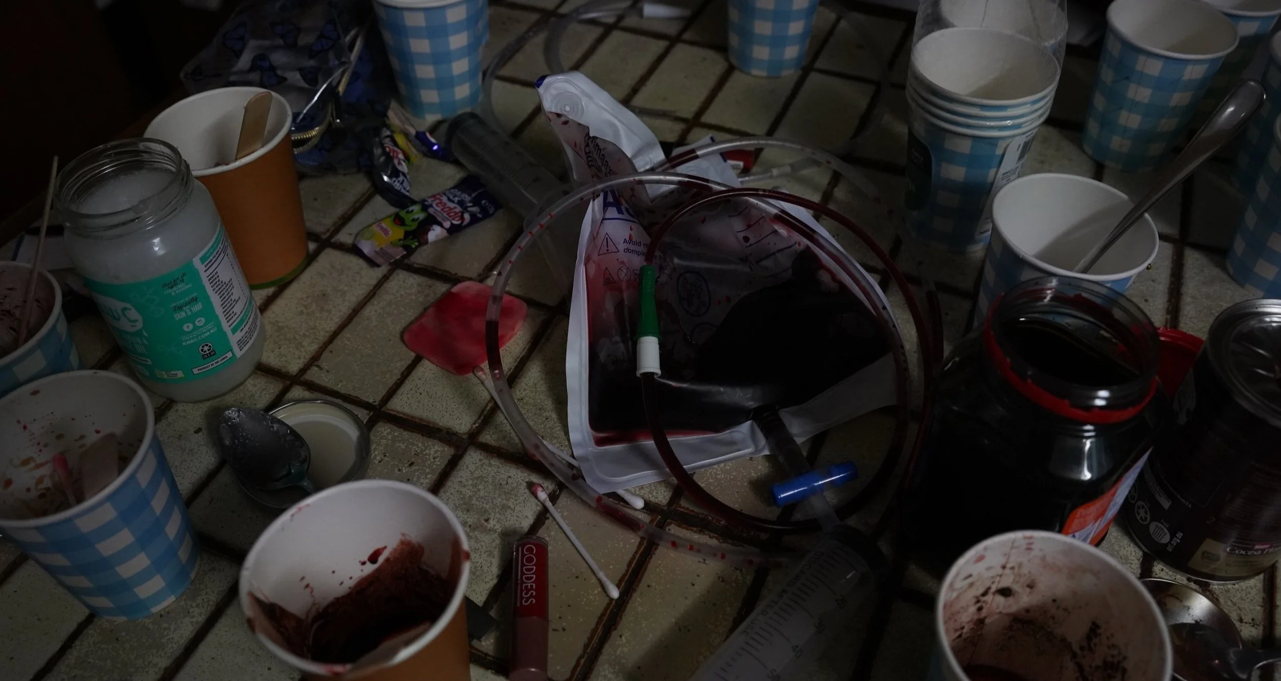 After much deliberation, she came up with a design using medical tubing and got to work experimenting with making fake blood with different textures, consistencies and colours. She also used the same different types of fake blood to build each makeup look to be as realistic as possible. Some of the mixtures were edible as well so the actors could spit out blood.